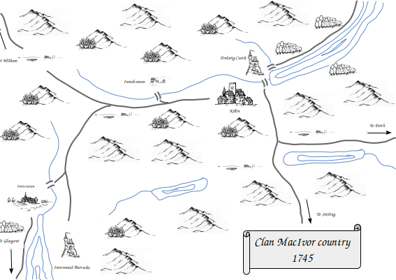 Fergus MacIvor is cousin of the chief of clan MacIvor holding the lands around his house of Innishewan in his own right with a tightly knit ‘tail’ of well armed highland warriors. Alastair, the chief, has taken up a commission with the British army and left to join his regiment with General Cope at Stirling leaving Fergus to splutter into his claret about loyalty to the true royal house of Scotland.